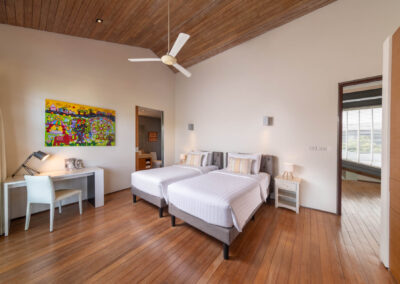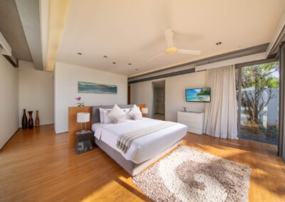It has two exquisite master suites: a romantic top-floor sanctuary with a dramatic peaked roof and panoramic sea views, and the other a stylish retreat overlooking the pool on the lower floor. It also has four spacious and stylish guest bedrooms throughout the villa, each one equipped with top-of-the-line amenities and stunning views at every turn.