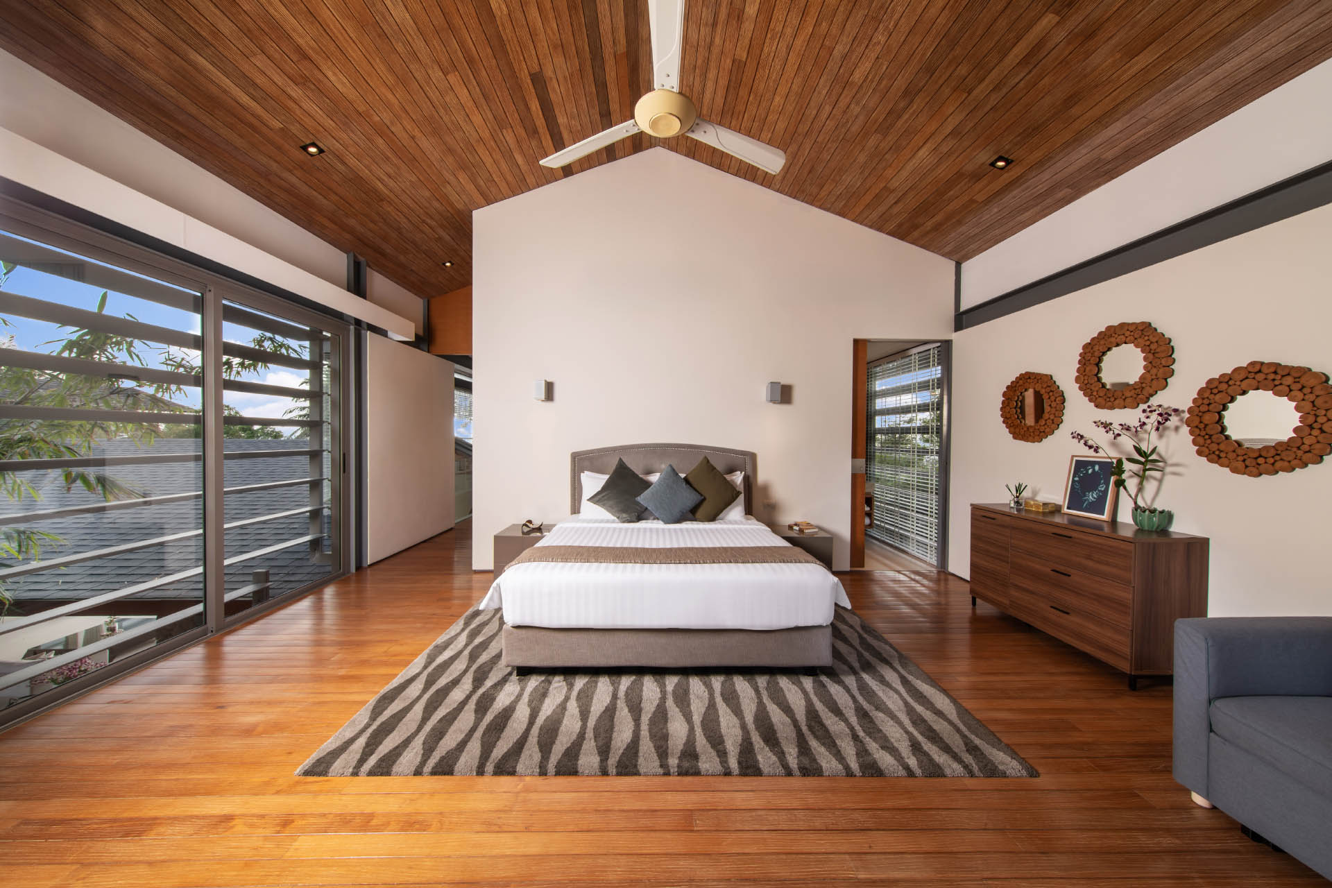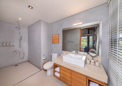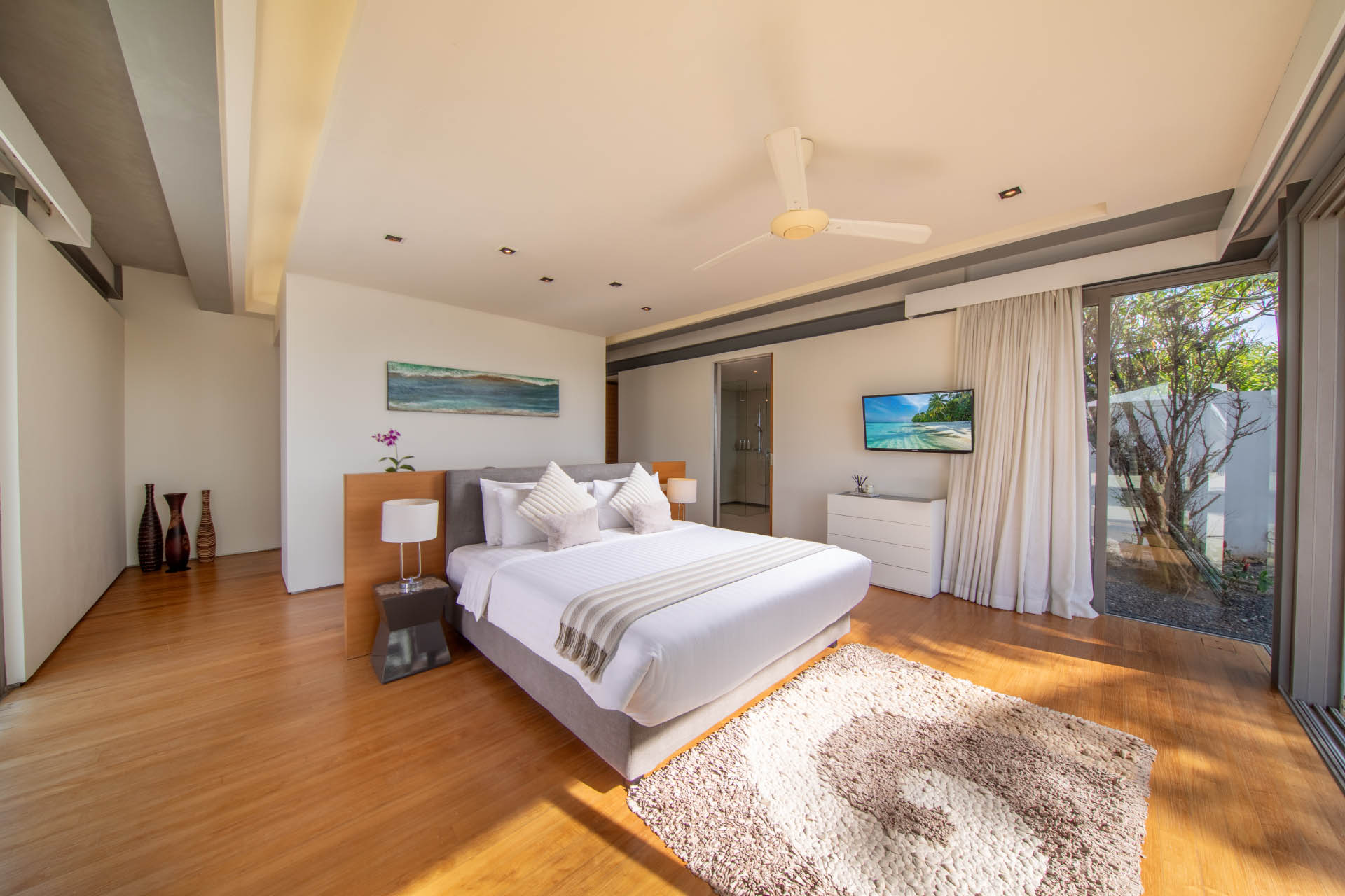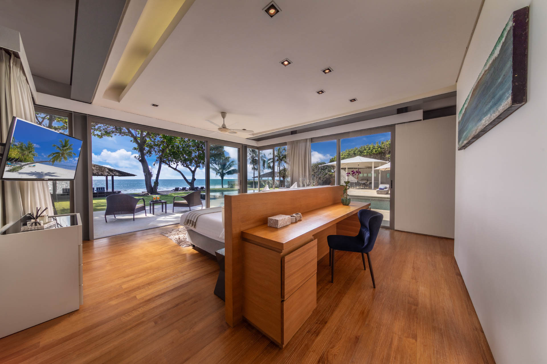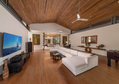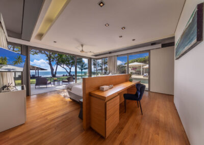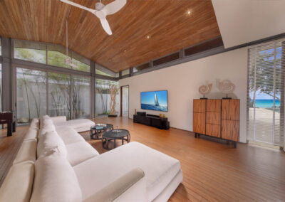 At the heart of Villa Cielo is its expansive living area, where floor-to-ceiling glass doors seamlessly merge indoor sophistication with the splendrous outdoors. Step outside and be captivated by the 25m-long infinity pool, which is surrounded by a sundeck where guests can enjoy leisurely afternoons under the sun. A shaded barbecue dining area offers the ideal setting for al fresco gatherings, while a sala provides a tranquil retreat amidst the soothing rhythm of the waves.