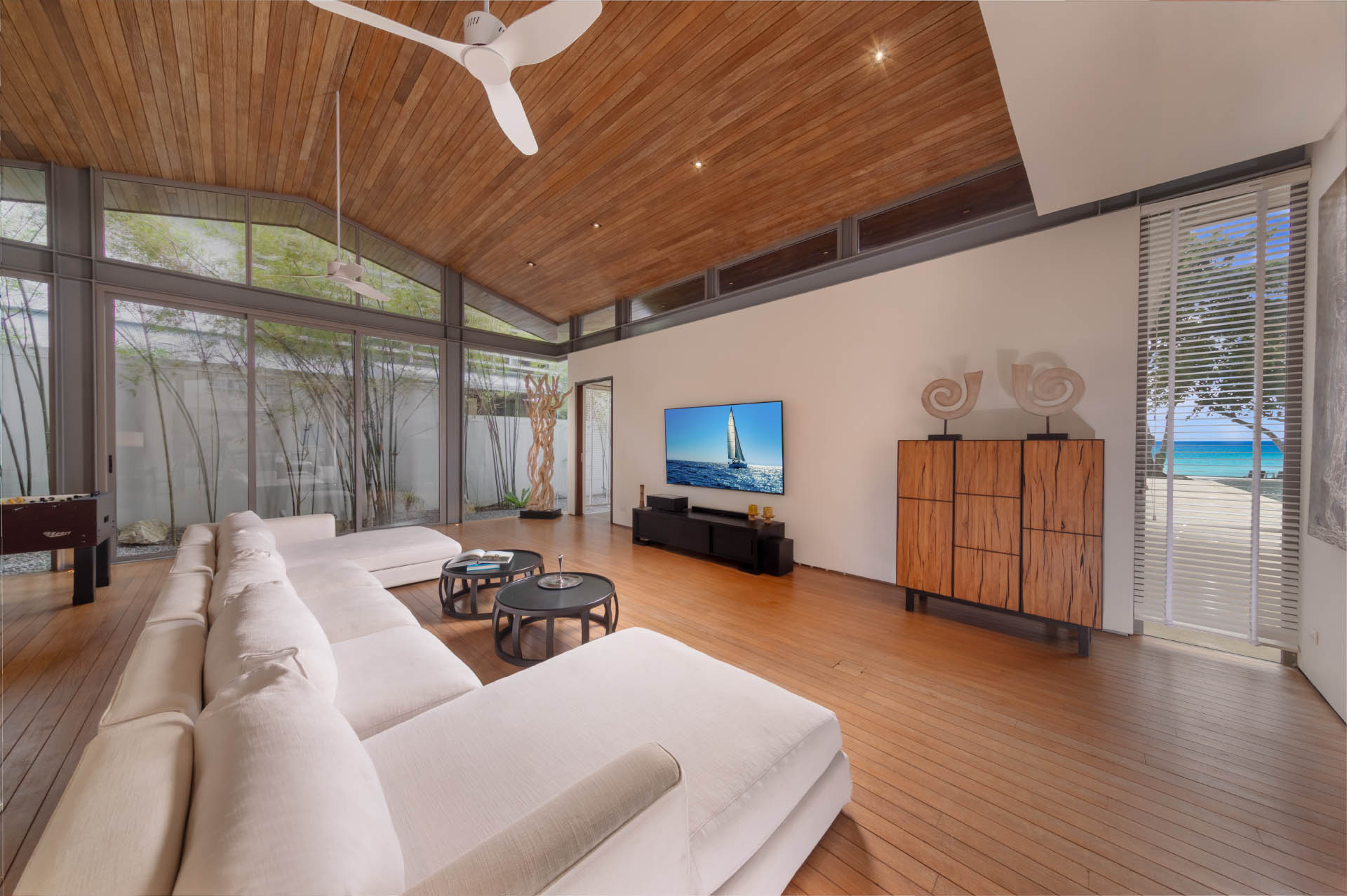 The versatile living and dining area feature floor to ceiling sliding doors, which can be opened or enclosed with aircon, plus a media room with an X-size TV.