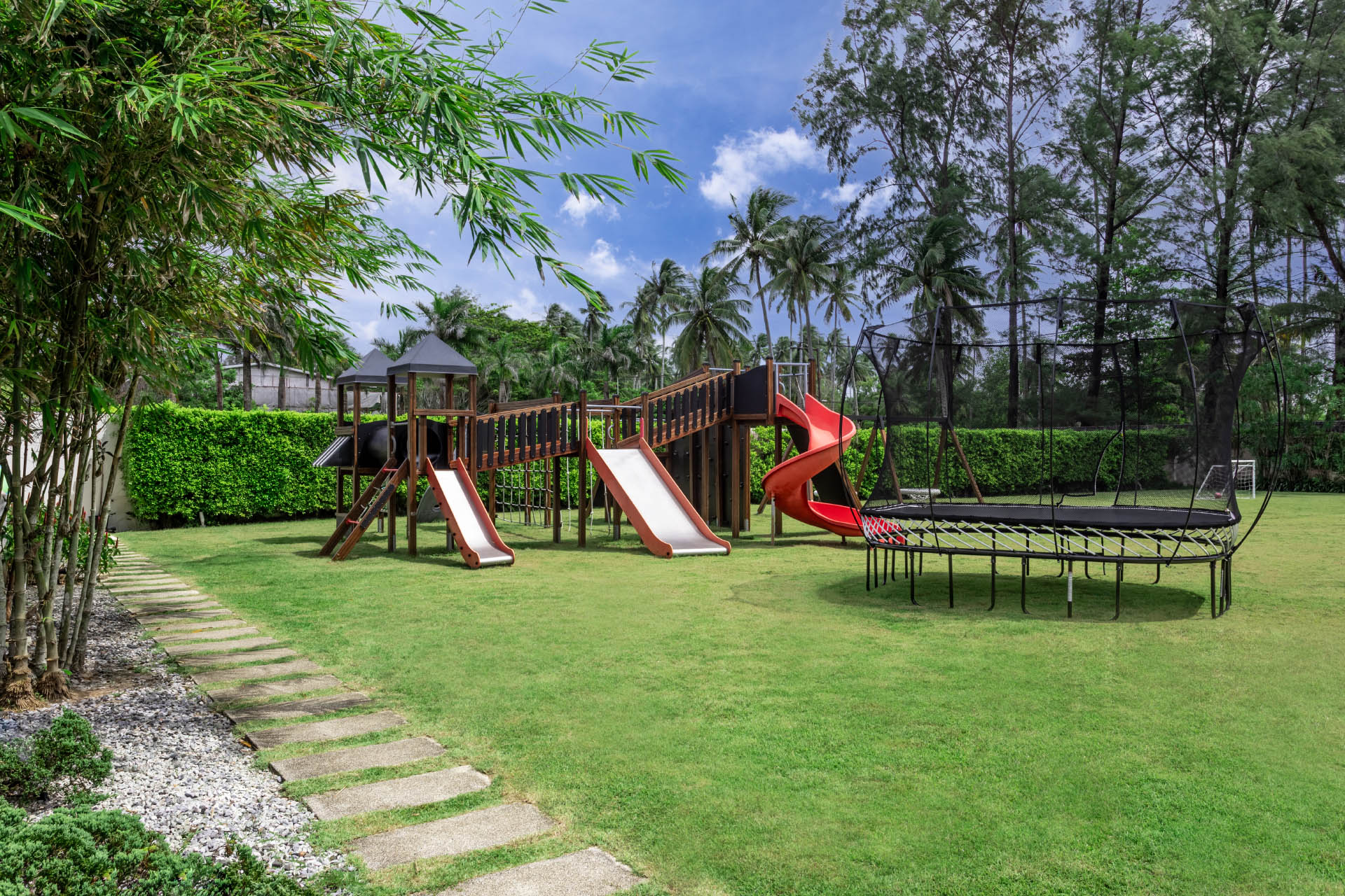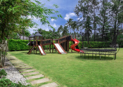 Let your kids unleash their inner adventurer at the villa’s backyard playground. This spacious outdoor area features a bouncy trampoline, joyful swings, and fun slides.
