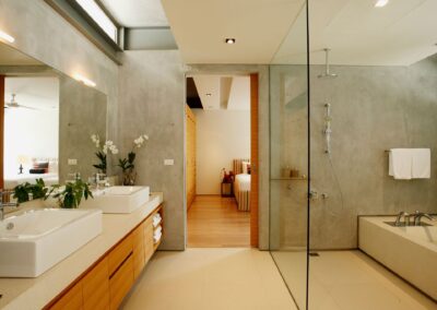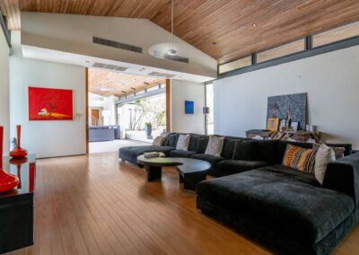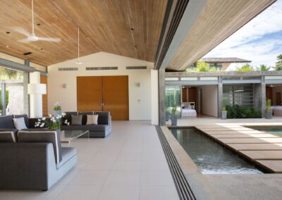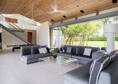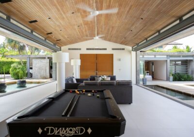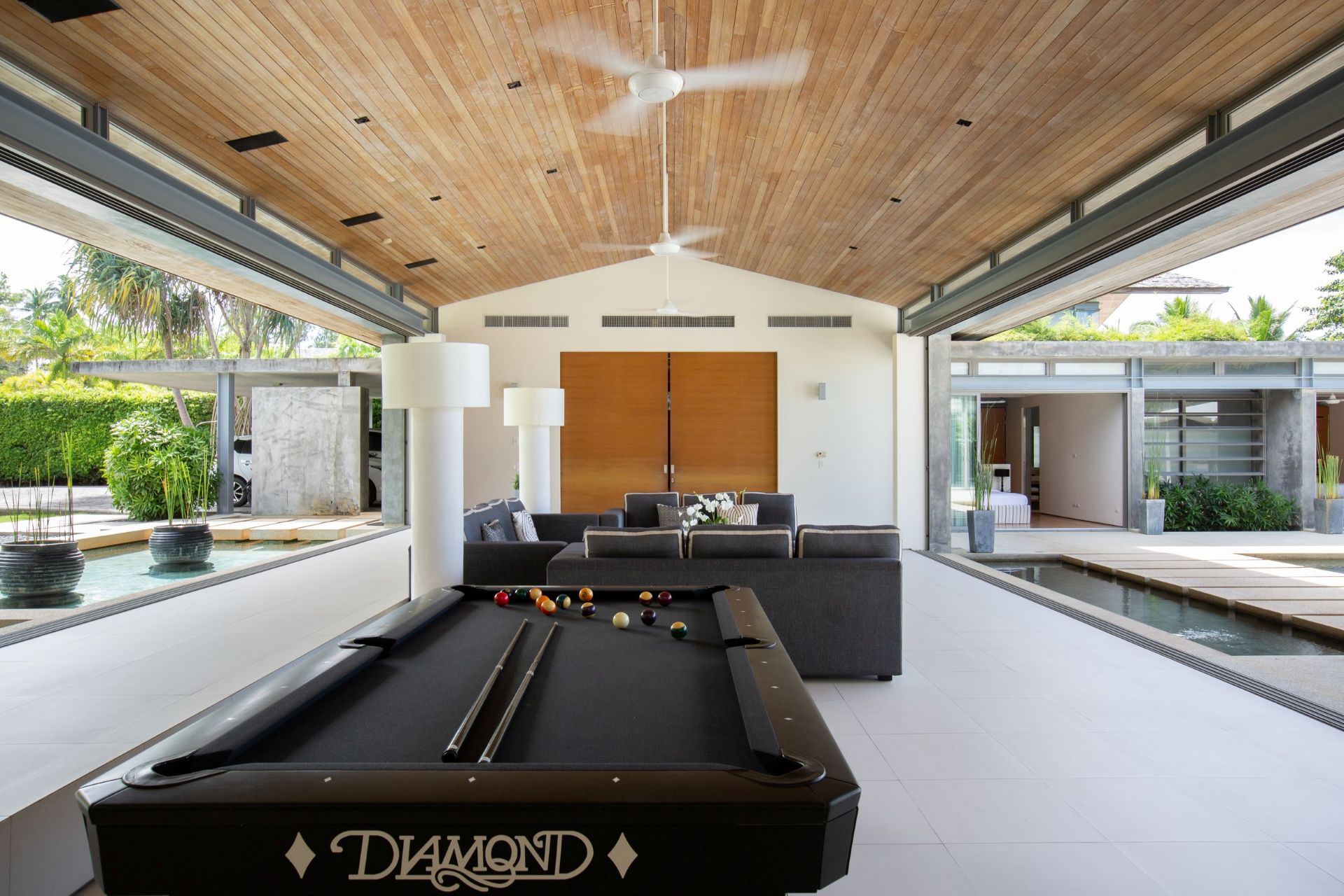 Upon entering this open-plan villa, guests are greeted by floor-to-ceiling glass doors that seamlessly connect its light-filled indoor spaces with the tropical outdoors, all while inviting in the ocean breeze. Adjacent to the living area, the TV room provides a cosy retreat perfect for movie nights. The expansive outdoor space offers ample opportunities for recreation and relaxation. Lounge on the sun-drenched decks, engage in a friendly volleyball game, play a fun football match on the lawn, or enjoy the outdoor dining as well as barbecue area.