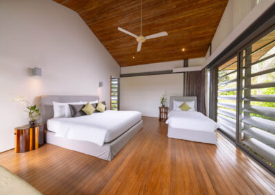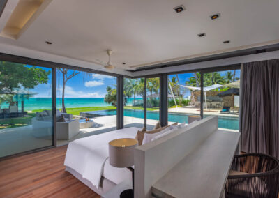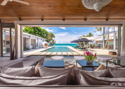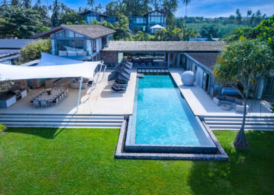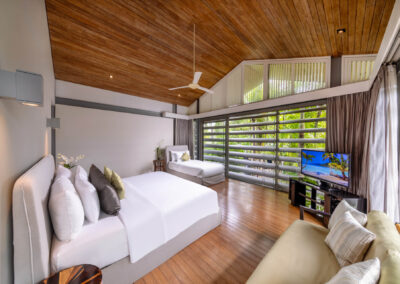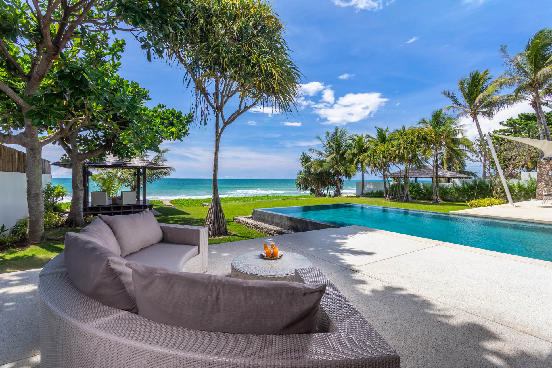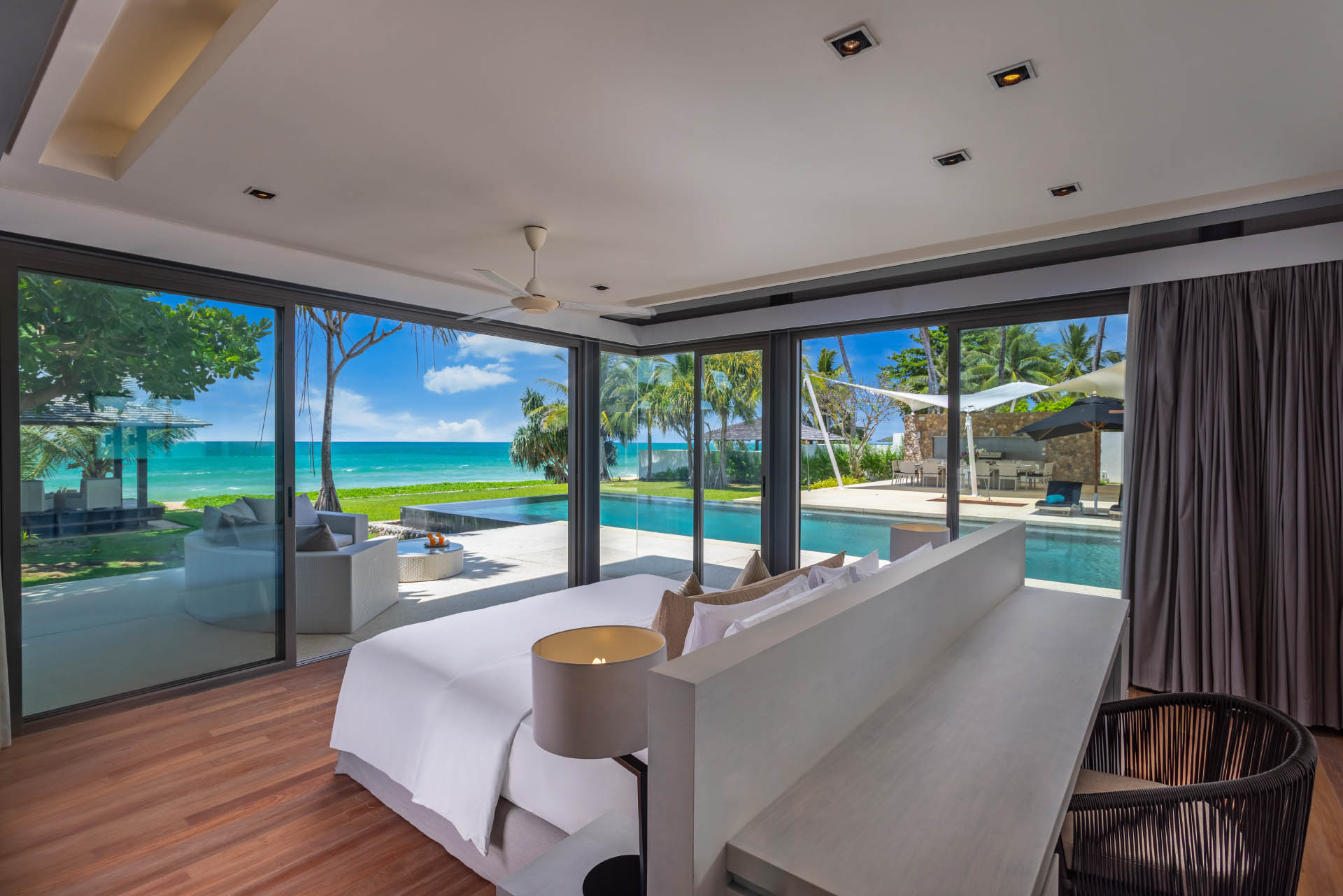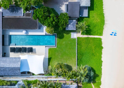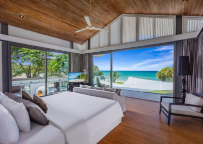 The villa’s bright, open-plan layout features floor-to-ceiling windows and striking timber accents. Lounge in the entertainment room, enjoy quality time with the little ones in the playroom or indulge in me-time at the expansive spa. Outside, a 25m-long infinity pool awaits, surrounded by a poolside bar and barbecue area. The beachfront lawn also features a charming sala offering panoramic views. Guests have direct access to the beach where they can enjoy water sports or simply swim in the calm waters of the Andaman Sea.