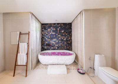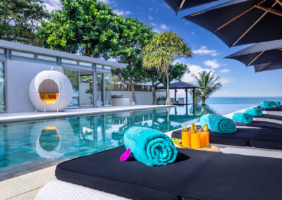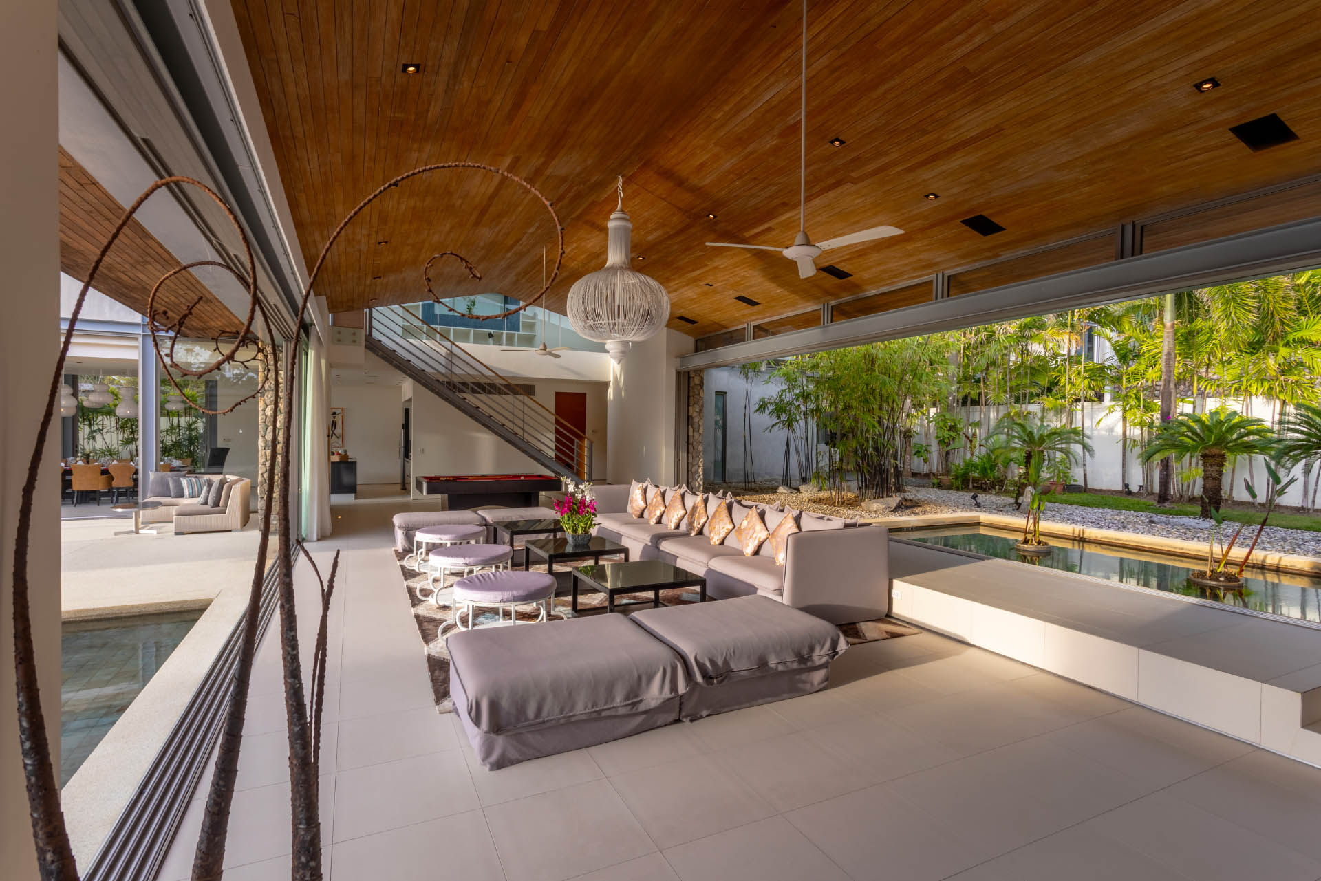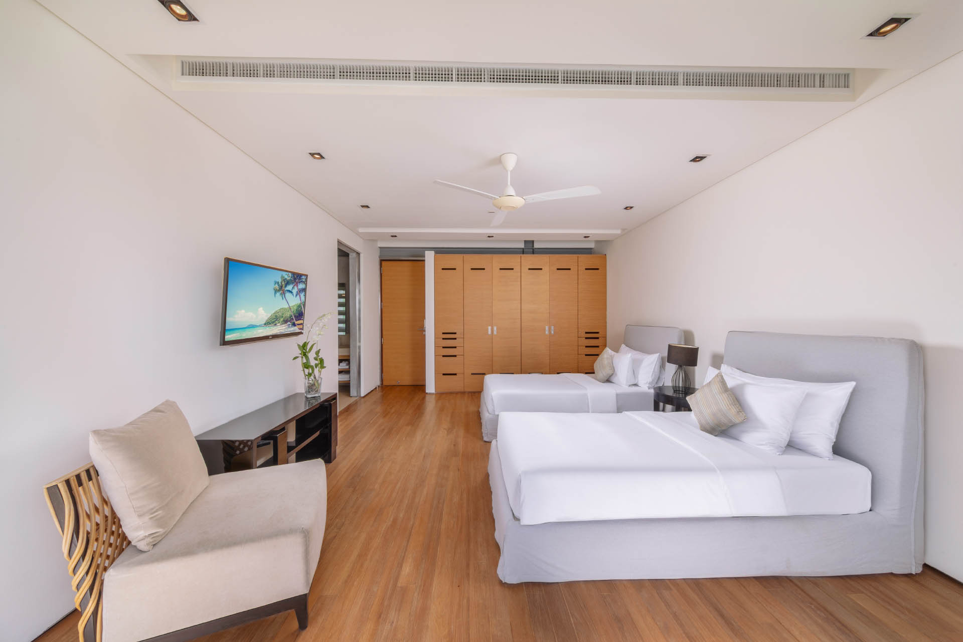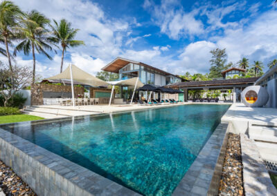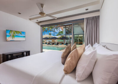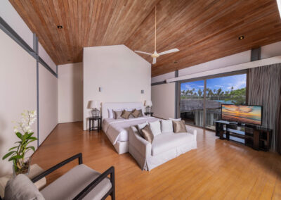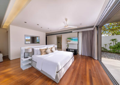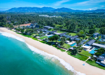 The villa’s bright, open-plan layout features floor-to-ceiling windows and striking timber accents. Lounge in the entertainment room, enjoy quality time with the little ones in the playroom or indulge in me-time at the expansive spa. Outside, a 25m-long infinity pool awaits, surrounded by a poolside bar and barbecue area. The beachfront lawn also features a charming sala offering panoramic views. Guests have direct access to the beach where they can enjoy water sports or simply swim in the calm waters of the Andaman Sea.